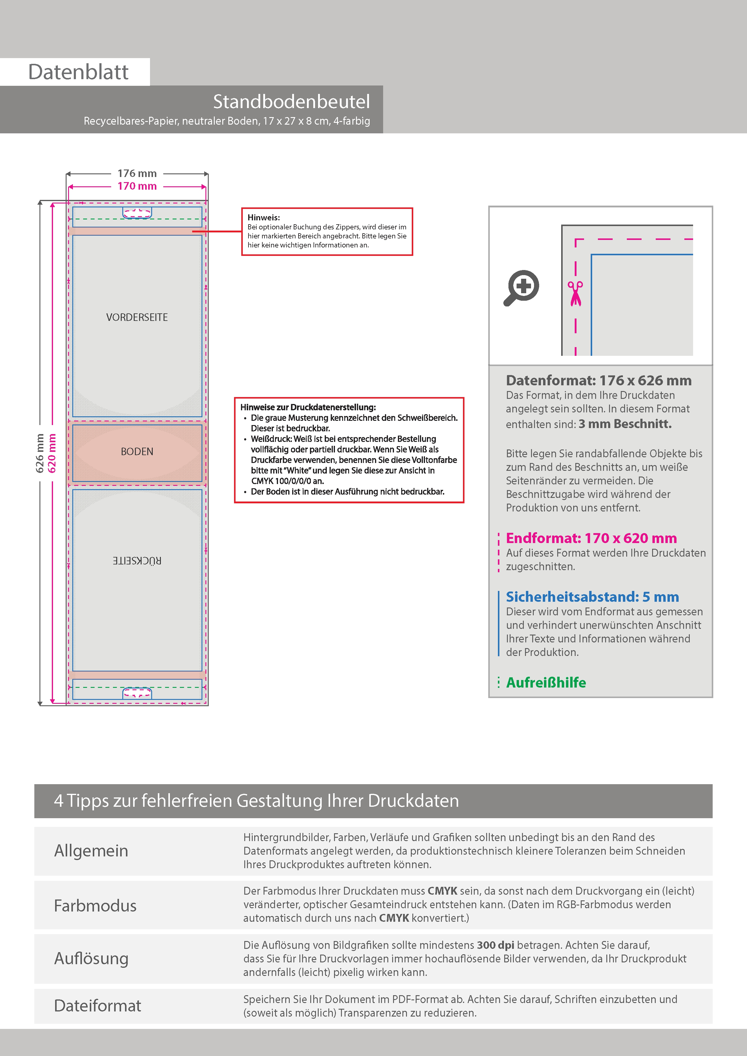 Recycelbares-Papier-Standbodenbeutel 17 x 27 x 8 cm mit neutralem Boden, 4-farbig bedruckt