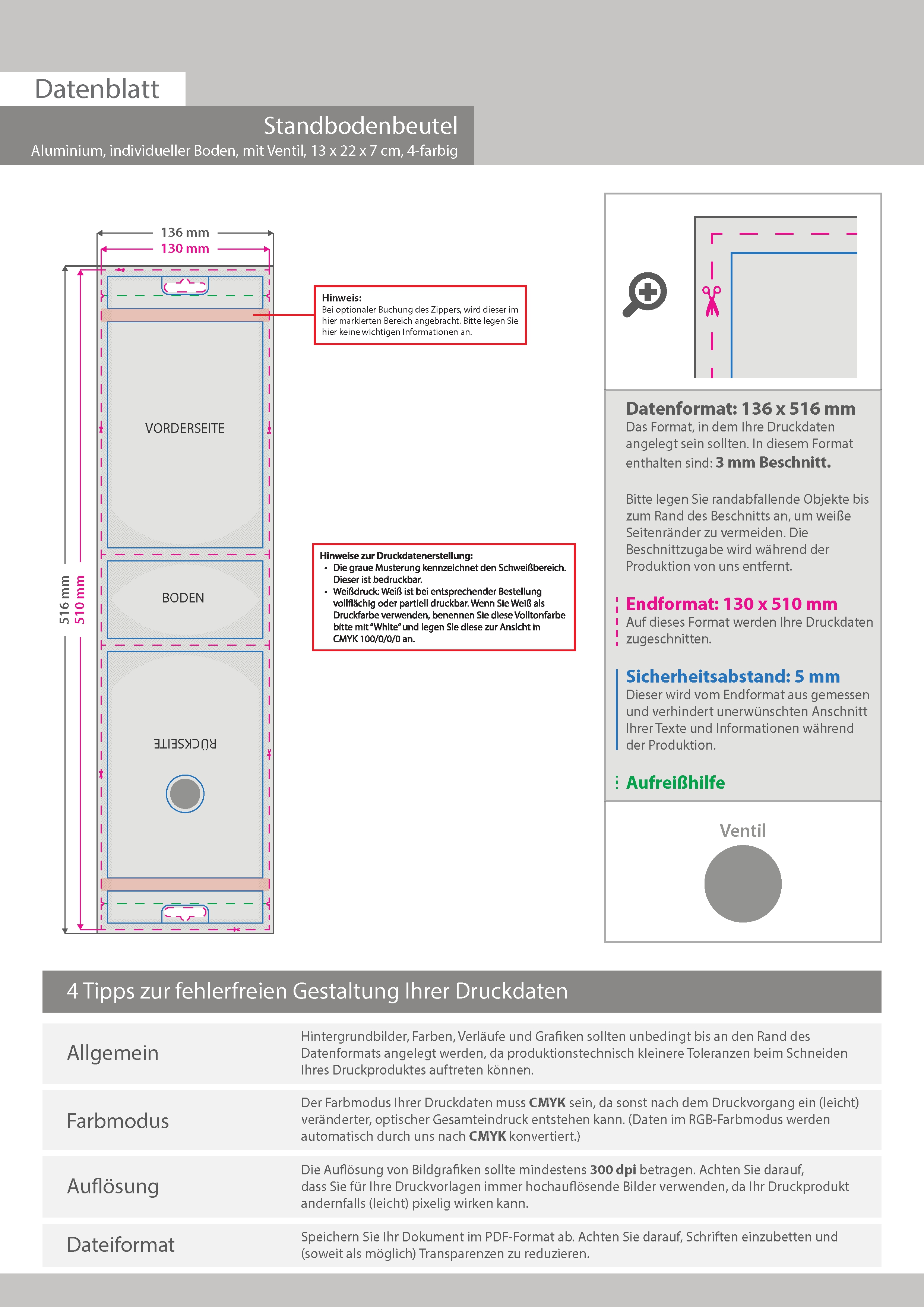 Aluminium-Standbodenbeutel 13 x 22 x 7 cm mit individuellem Boden und Ventil, 4-farbig bedruckt