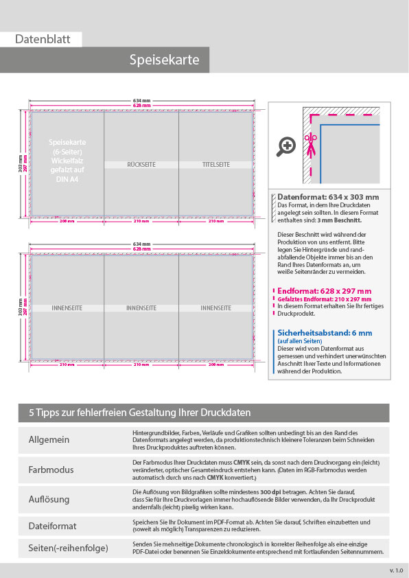 Speisekarte, gefalzt auf DIN A4, 6-seiter (Wickelfalz)